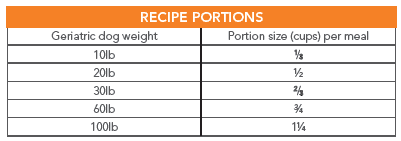 Portion sizes are always a challenge. The sample dog recipe in this article usually provides enough calories for one meal for a 60lb dog. However, if the geriatric patient is particularly energetic, it may not yield enough calories. This is a bigger problem for those who feed raw meats without vegetables. Vegetables, especially roots like sweet potato, provide carbohydrates, a calorie source. For some lower energy geriatric dogs, this recipe will provide too many calories – in this case, remove 25% of the sweet potato. Regardless of the type of food (real, canned or dry), any time a dietary change is made, the body condition should be checked every two to four weeks.