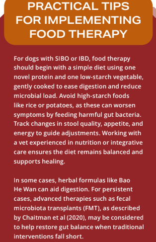 This article provides strategies for adapting food therapy to suit dogs with complex gastrointestinal issues, such as SIBO and IBD.