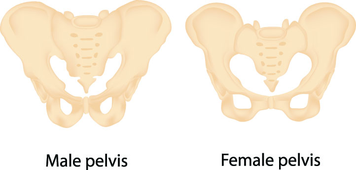 A woman’s hip bones are articulated at the joint differently than a man’s. Male hip sockets are much further forward, so their legs can naturally hang straight down.