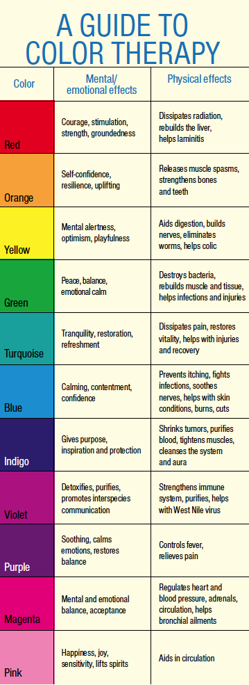 Color therapy is an ancient form of healing with roots in India, Egypt, and China. Originally, the term referred to treatment with colored light, but nowadays there are many additional approaches to healing with color.