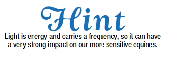You can simply shine an appropriately colored light in the direction of the area you are trying to heal, or in the general direction of the horse. If you don’t have a colored bulb, you can shine a regular light bulb through a theatrical color gel. This may take a bit of ingenuity to set up, but will be well worth the effort.