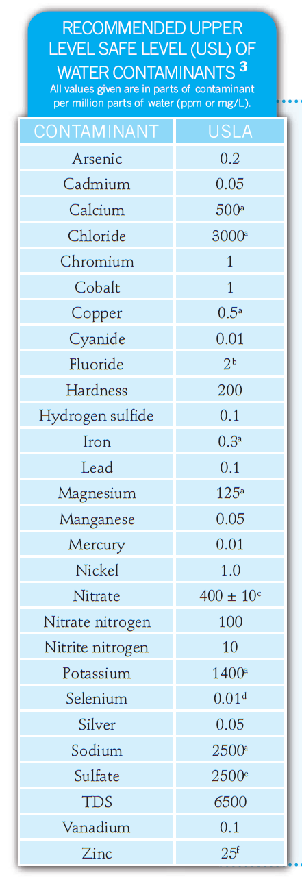 a) These contaminants are not toxic but at concentrations above the amount given may decrease water palatability. In contrast, many of the other contaminants listed may be toxic if water containing concentrations above those given here is the only water consumed.