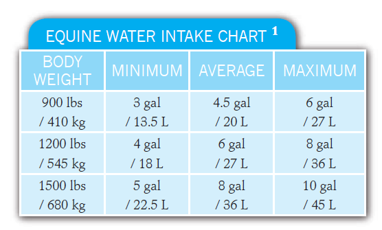 There’s an old saying: “You can lead a horse to water but you cannot make him drink.” But you can increase the likelihood he will take a drink if you ensure his water source is optimally palatable. Here is a chart indicating minimum, average and maximum daily water consumption by body weight: