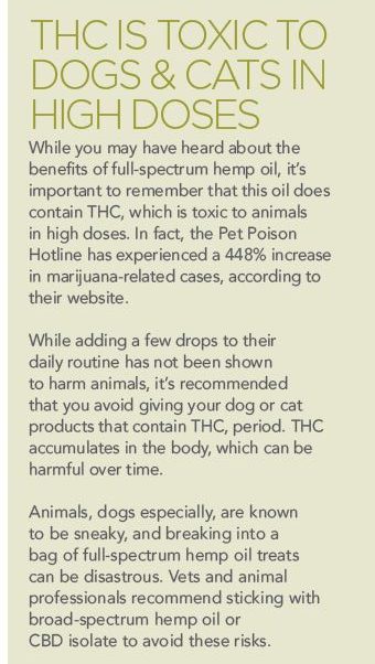 Avoid THC: Because THC is toxic to pets in high doses (see sidebar at right), it’s best to avoid it altogether. Your pet will still get the advantages of the entourage effect with a broad spectrum oil that contains no THC, so why take the risk at all?