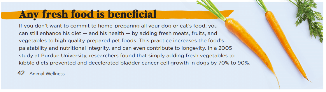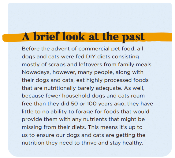 While you should strive to do your best to provide your dog or cat with all the essential nutrients he needs, keep in mind that home-preparing food for animals is not an exact science. Charts describing the nutrient composition of individual foods and ingredients are useful, but each batch of meat or vegetables will have different levels of vitamins and minerals, depending on their growing conditions, their age at harvest, and many other variables. You can compensate for this by offering plenty of variety to your dog or cat, as well as adding in some supplements (again, more on this below). By doing this, it’s not so difficult to feed your animal high quality food that will enhance his health and longevity.