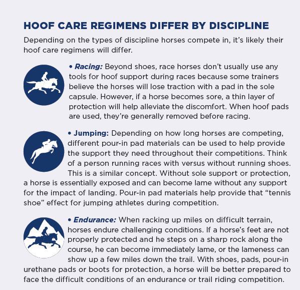 More than ever before, veterinarians and farriers have the ability to use materials that will help maintain hoof function. Talk to your hoof care professional about the importance of keeping your horse comfortable and competing at his full potential.