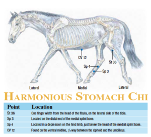 Acupressure is based on Traditional Chinese Medicine (TCM) and has been used for thousands of years to maintain and build equine health. From the perspective of TCM, a smooth and harmonious flow of Stomach Chi (life-promoting energy) will help the horse create healthy, nutrient-rich blood and not fall prey to stomach disorders.