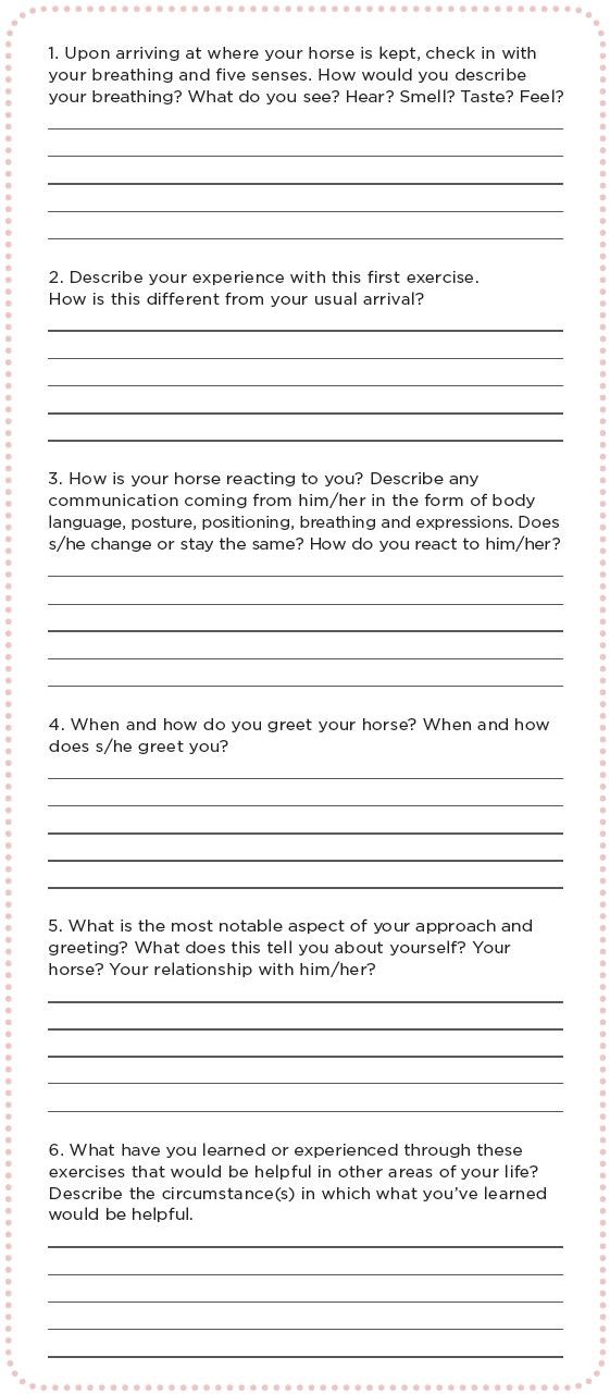 This particular set of exercises and prompts includes a basic mindfulness exercise and is tailored to your arrival at the barn, your approach to your horse, and your greeting. However, they can easily be modified to apply to grooming, tacking, groundwork, riding, and the intervals pre- and post-interaction with your horse.