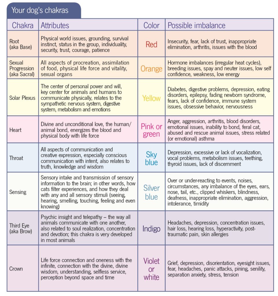 Dogs have both major and minor chakras, but for the purposes of this article we are going to concentrate solely on the eight major chakras (see accompanying table).