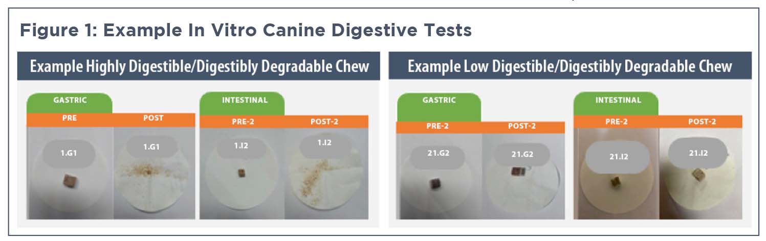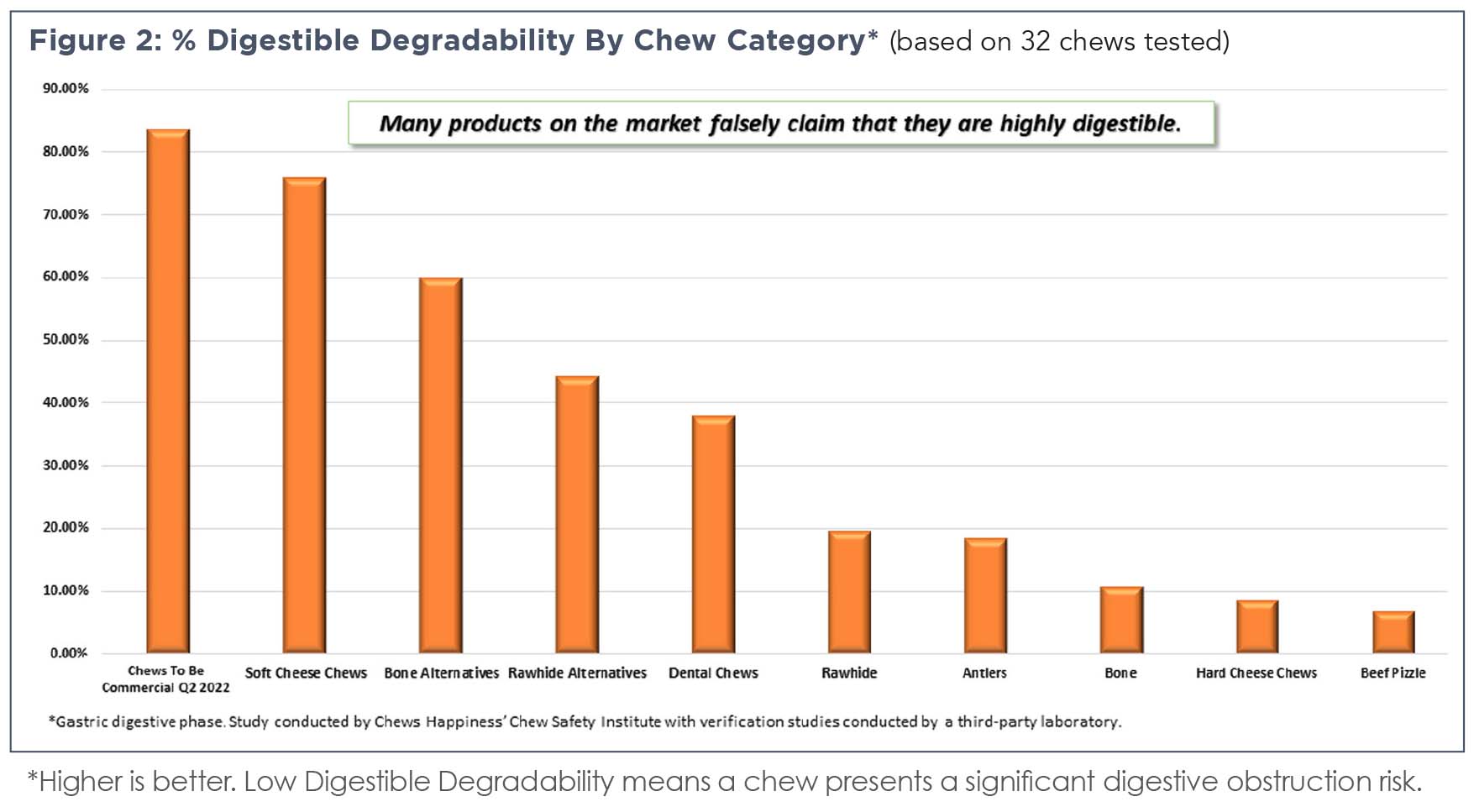 Unfortunately, we found that only one commercial chew we tested (3.13%) can be considered safe. This product is not durable. Eighteen chews we tested (56.25%) claim high digestibility on their packages, yet none exhibited this consistently. Two new chews to the market (commercialization Q2 2022) claim “Highly Digestible Degradability” and they tested that way (Figure 2).