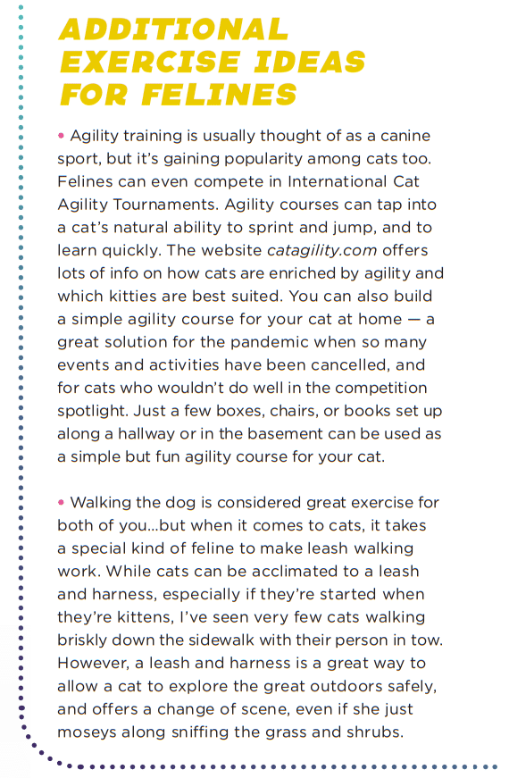 Toys aren’t the only way to engage your cat in exercise (see sidebar). Experiment and change things up to find out what your cat likes doing most. The more she loves the activity, the more willing she’ll be to do it. By combining your cat’s natural athleticism with at least half an hour of daily exercise, you’ll keep her trim and mentally stimulated, while strengthening your bond of love and companionship.