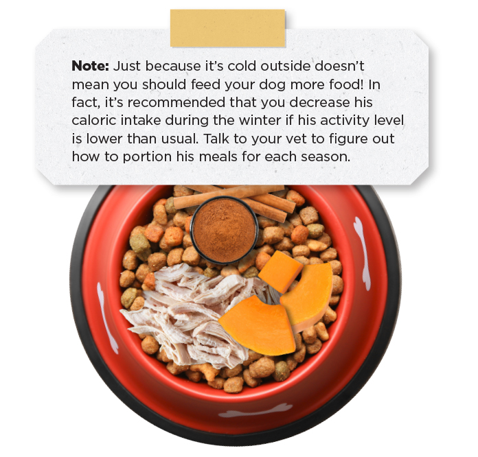 According to ancient Chinese Medicine, certain meats, grains, vegetables, herbs and other foodstuffs have a warming effect on the body. Add a sprinkle of cinnamon to your pups daily meals to help warm him from the inside out, and switch his primary protein source to a warming meat, such as lamb, venison or chicken. Heating his food (just enough to take the chill off it) can also be a welcome treat during the winter months.