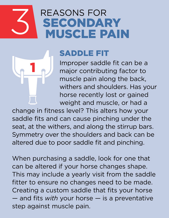 - Secondary muscle pain can stem from improperly-fitting equipment, foot soreness or arthritis. Symptoms can be seen in behavioral changes such as a reluctance to go forward, bucking, tail swishing, and changes in overall demeanor. As a start, observe and differentiate between primary and secondary muscle problems.