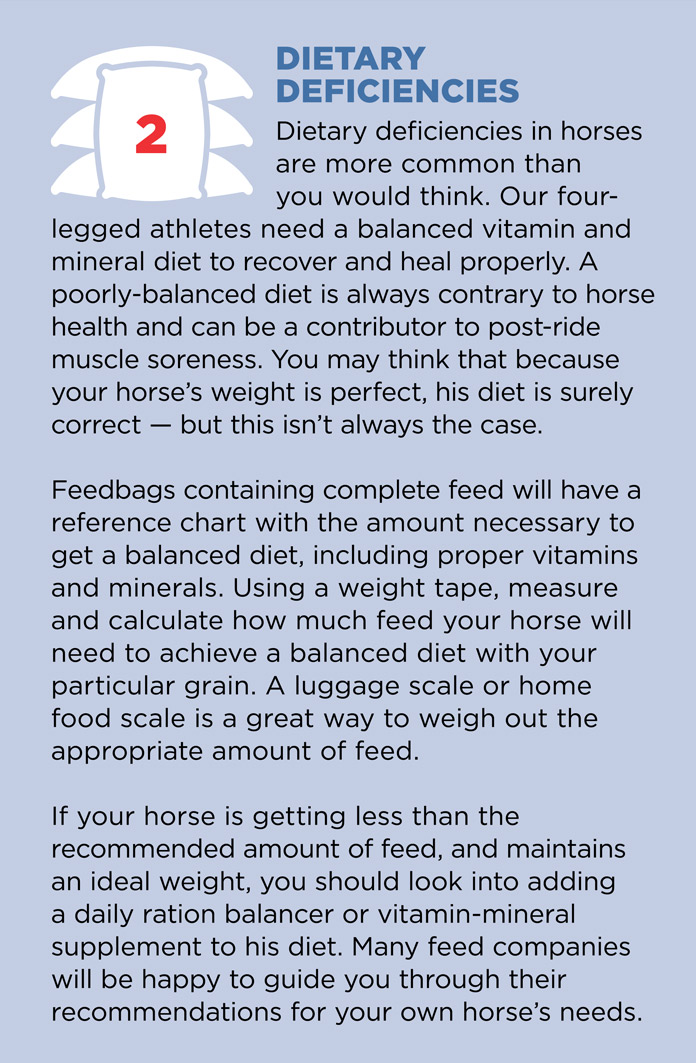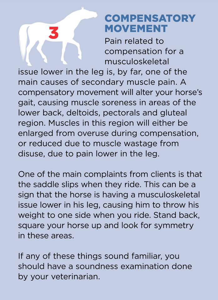 While secondary muscle pain is more common than primary, it can be frustrating to diagnose its exact cause (see sidebar below). The multitude of contributing factors include, but are not limited to: poor fitness, dietary deficiencies, improper saddle fit, shoeing problems, or altered movement due to joint pain. This type of pain usually presents as a mild reluctance to go forward; behavioral changes under saddle, such as bucking, spooking or excessive tail swishing; or behavioral changes while being groomed or shod. Keeping this in mind, you can often address and correct some of these problems prior to a veterinarian visit.