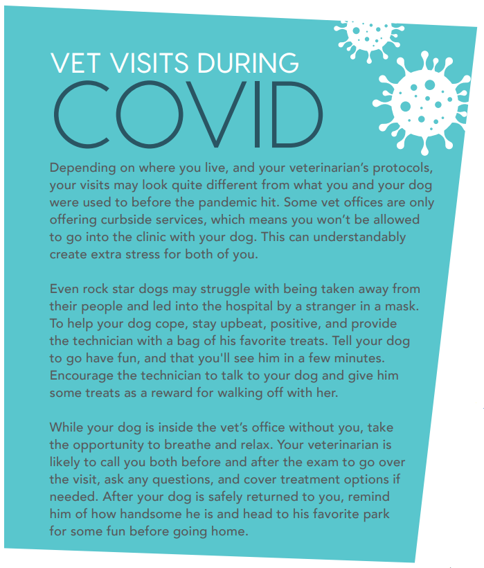 • In the waiting room, find a spot where you and your dog can relax and do a few tricks. Keeping your dog focused on you in a fun way while earning some rewards is a great way to ward off stress.