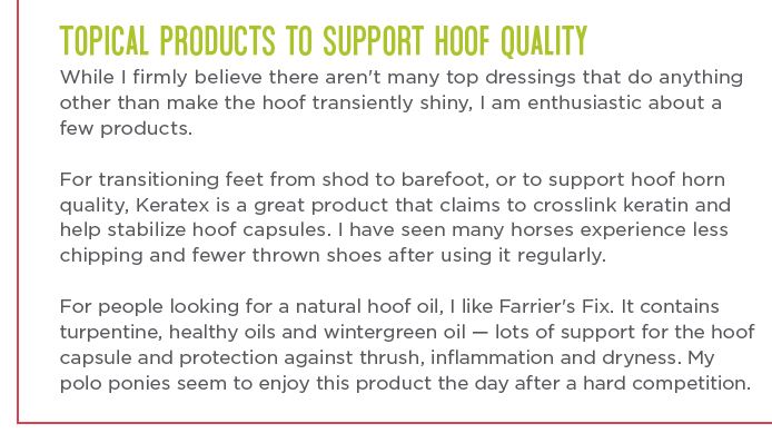 Once again, your veterinarian is a great source for which feed company and type is best for your horse, but the main message is to take care of your horse’s major nutrition needs of fiber, protein and calories. For most horses, meeting these needs will result in good hoof quality.