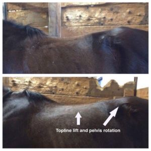How were these changes achieved? When a horse’s TMJ is able to properly rotate, the anterior/posterior motion of its mandible is increased, which in turn increases the range of motion in the horse’s entire body. Increased range of motion leads to increased muscle stretch, stimulating the local release of hormones allied to the insulin-related growth factor. The result is an increase in the number and length of sarcomeres, the basic element of a striated muscle fiber. The ability to move and therefore stretch through the topline stimulates the development of these muscles.