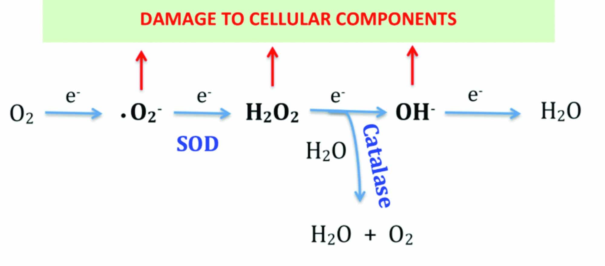 Oxidative stress due to reactions of superoxide anion radical, hydrogen peroxide and the hydroxide ion with cellular components is mitigated by the actions of superoxide dismutase and catalase.