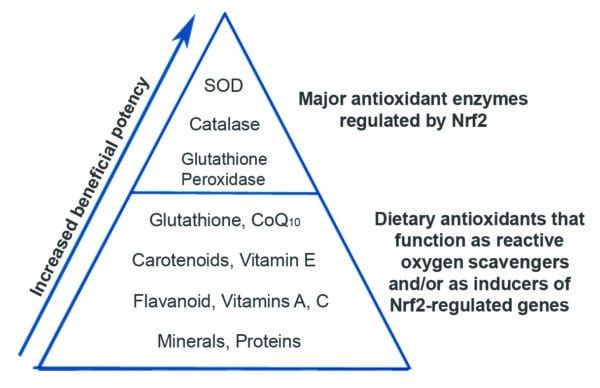 Many substances have beneficial antioxidant effects. Several small molecules are ROS scavengers, reacting 1:1 with a single ROS. Hence, large quantities are needed to combat oxidative stress. Other components of the diet, including several carotenoids, activate the expression of Nrf2-regulated genes, increasing the levels of several protective enzymes, including catalase and superoxide dismutase (SOD), with each enzyme capable of inactivating huge numbers of ROS for prolonged periods.