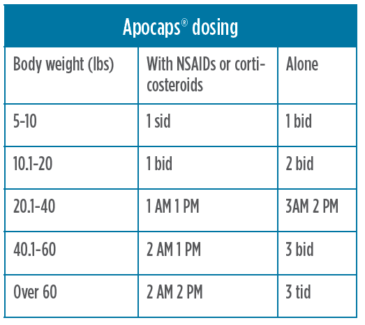 Apocaps® CX is a commonly-used source of botanical COX-2 inhibitors with chemosensitizing and radiosensitizing effects. It is designed for dogs and has a high safety margin. Note that if Apocaps® is administered with corticosteroids or pharmaceutical NSAIDS, it is advisable to use approximately half the labeled dose. This nutraceutical is best given with at least a small amount of food.