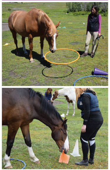 I have colored cones and hula hoops that are fun to use. We start by walking toward the objects with me slightly ahead so that the horse is constantly perceiving me as lead mare. I notice what my horse prefers and might ask her to touch a cone with her nose or pick it up. Not only does this add some variety to your sessions, it also works to de-sensitize your horse to things she might be fearful of.