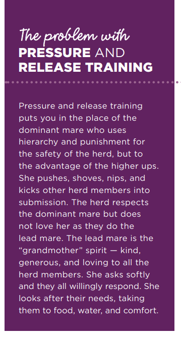I learned the “invitation and reward” approach to training from the lead mare in my herd of 16 horses. When she walks through the herd, it is as if the water parts. She kindly and softly focuses on any body part that’s in her way, using clear intent. Through observing these gentle but effective movements, I’ve learned how to incorporate them into my own work with horses.