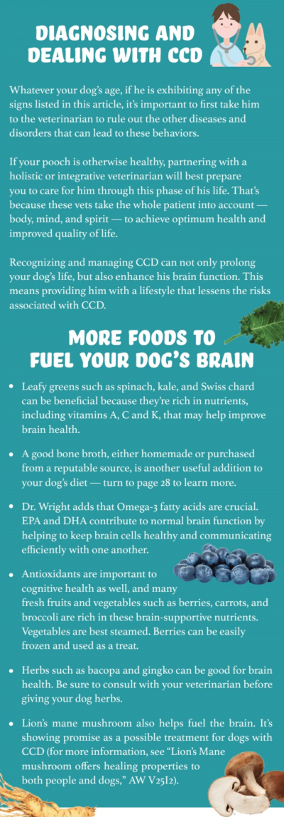 Its never too soon or too late to start looking after your dogs brain health. Feeding a young dog a nutritious, brain-supportive diet may help stave off the possibility of CCD as she ages; but even a dog already showing signs of dementia can benefit from these foods and supplements. Above all, be sure to add a generous dose of love and patience to the mix!