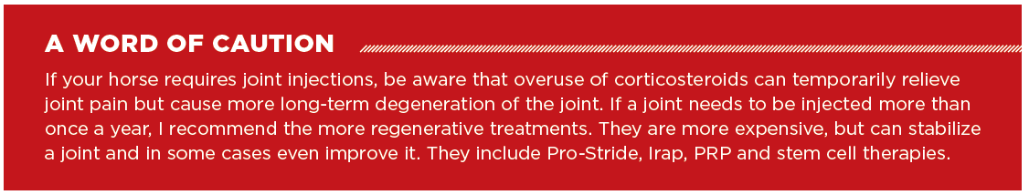 At the end of the day, the more balanced your horse is, the less wear and tear on his joints. Also, the less compromised his GI system, liver and kidneys are, the stronger his immune system, and oral or injectable joint supplements will be most effective.