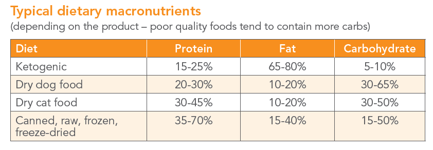 A typical nutrient ratio is about 15% to 30% protein, 70% to 75% fat, and 5% to 10% carbohydrate. Contrast this with a typical commercial dry dog food, which contains around 20% to 30% protein, 10% to 20% fat, and 30% to 65% carbohydrate; or a similar dry cat food, which has about 30% to 45% protein, 10% to 20% fat, and 30% to 50% carbohydrate (see chart below). Canned, freeze-dried, dehydrated and frozen diets tend to have more protein and fat, but depending on the product, may still contain 15% to 50% carbohydrate. (You can estimate the carb content of a pet food by looking at the Guaranteed Analysis on the label. Subtract the protein, fat, fiber and moisture from 100; the remainder is digestible carbohydrate.)