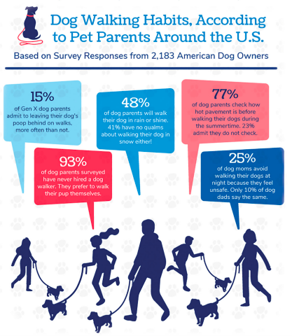 dog walking, walks, habits• 48% of dog parents will walk their dog in rain or shine, and 41% have no qualms about walking their dogs in the snow!