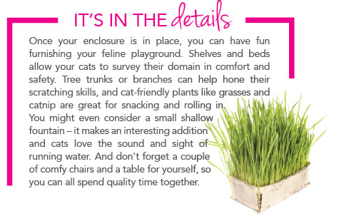 A cat enclosure offers the ultimate in outdoor feline fun. You can build your own if you have the carpentry skills, or buy a kit or custom-designed product from a manufacturer. Tineke Hofma created her own outdoor enclosure for her five Russian Blues. This kitty wonderland includes access doors to and from the house, along with a variety of beds and shelves for the cats to lounge on. It also has plants and an area for Tineke to sit and spend quality time with her felines. If you’re building your own enclosure, be sure the wire you choose will prevent furry bodies from squeezing through. A corrugated roof allows for all-weather access.