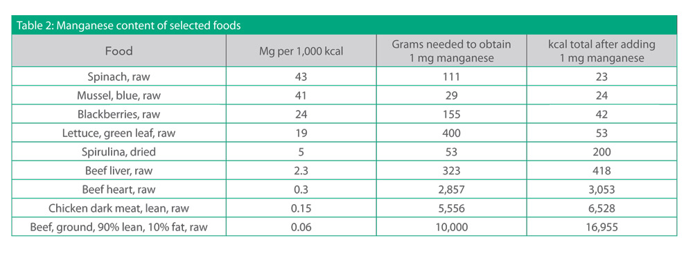 - If you’re feeding homemade, make sure his meals meets the ancestral diet requirements for optimal nutrient intake (not just for manganese, but for all nutrients). Follow a recipe that gives you the amount of manganese per serving or 1,000 kcal.