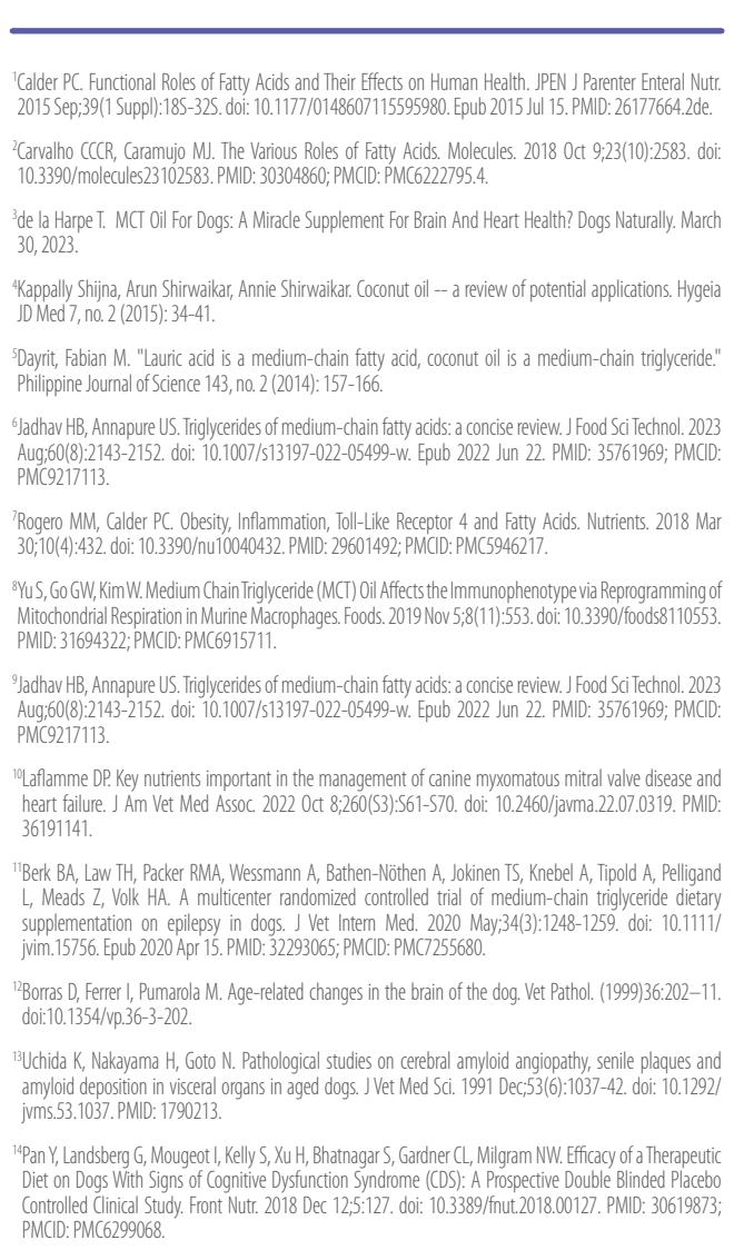 Heart disease can have different clinical presentations with varying degrees of severity. According to an article published in 2022 by the Journal of the American Veterinary Medical Association (JAVMA), the most common cause of heart failure in dogs is myxomatous mitral valve disease (MMVD), accounting for 75% of canine heart disease.10 Dogs with heart disease can have decreased mitochondrial energy metabolism as well as increased inflammation and oxidative stress. Medium chain fatty acids and ketones derived from medium chain triglycerides provide an alternative energy source for cardiac mitochondria, and help reduce free radical production.10