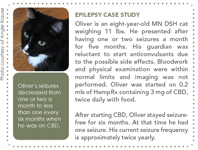 A recent study at Colorado State University demonstrated that dogs with osteoarthritis had improved pain scores with 2 mg/kg of CBD every 12 hours.7 It’s this author’s clinical experience that CBD improves the mobility and comfort of dogs and cats experiencing pain from osteoarthritis and neurogenic causes. Many traditional pharmaceuticals such as gabapentin, tramadol and amantadine have questionable efficacy and undesirable side effects. While non-steroidal anti-inflammatories are effective, many of the side effects