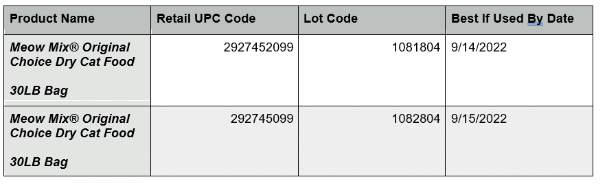 To find out if you have purchased the bags being recalled, check the bottom of the back of the bag for the lot code to see if it matches the code in the table below: