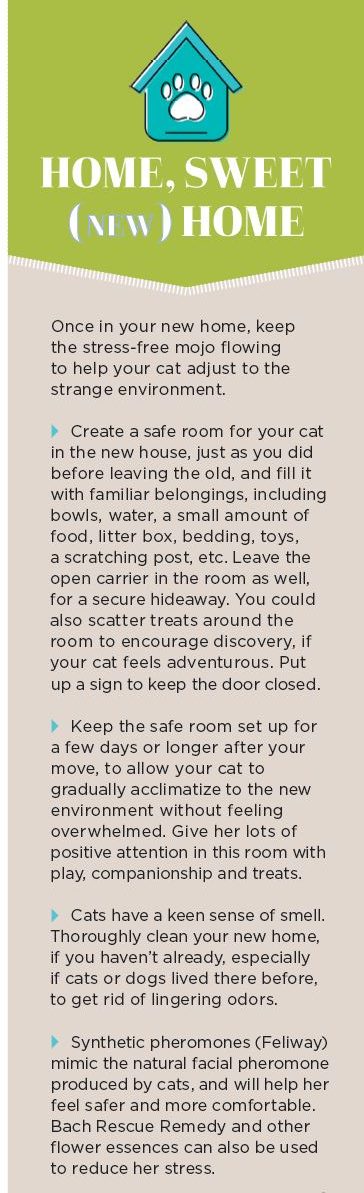 “You are the most familiar thing your cat has during a move,” says Dr. Koski. “You are also the one who is best able to determine what she needs. As her guardian, her well-being is your responsibility during this stressful time of change.”