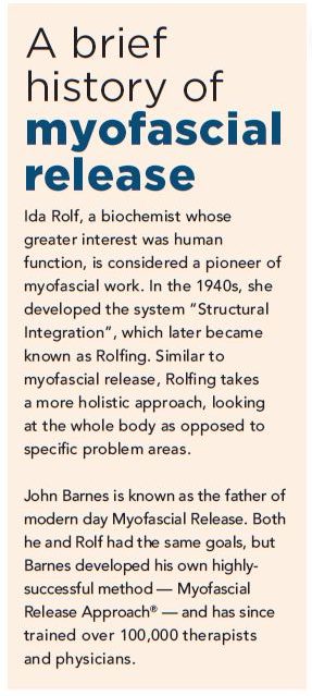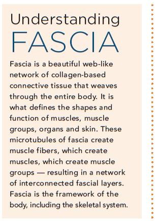 Myofascial release (MFR) has a lot in common with other massage techniques, but it has a different way of approaching a body’s individual issues. It involves a slower, gentler technique for whole body integration. Facilitating the client’s own body awareness while releasing restrictions in the muscles and fascia (see sidebar at right) creates far-reaching physical and emotional effects, and brings one to a deeper level of consciousness. “Intention” is a key word in this therapy, meaning that the practitioner should go into a session with a calm, mindful attitude and a goal of releasing tension in the tissue without forcing a desired outcome.