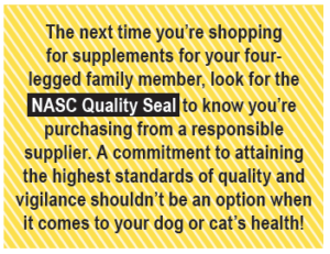 The next time you’re shopping for supplements for your four-legged family member, look for the NASC Quality Seal to know you’re purchasing from a responsible supplier. A commitment to attaining the highest standards of quality and vigilance shouldn’t be an option when it comes to your dog or cat’s health!