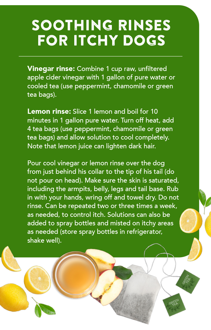 Set up the foot soak outside your door and walking your dog through it every time she comes indoors. This incredibly simple trick has kept many of my seasonal allergy patients off medications the entire summer. You can use my rinse recipes as foot soak solutions, or buy Povidone Iodine (Betadine) and dilute it to an iced tea color. This is especially beneficial for dogs that chew to the point of creating infections.