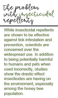 Used properly, natural tick repellents can provide a suitable alternative to toxic chemical-laden options available on the market. It’s always a good idea to get any tick treatment vet approved before use to avoid potential adverse effects.