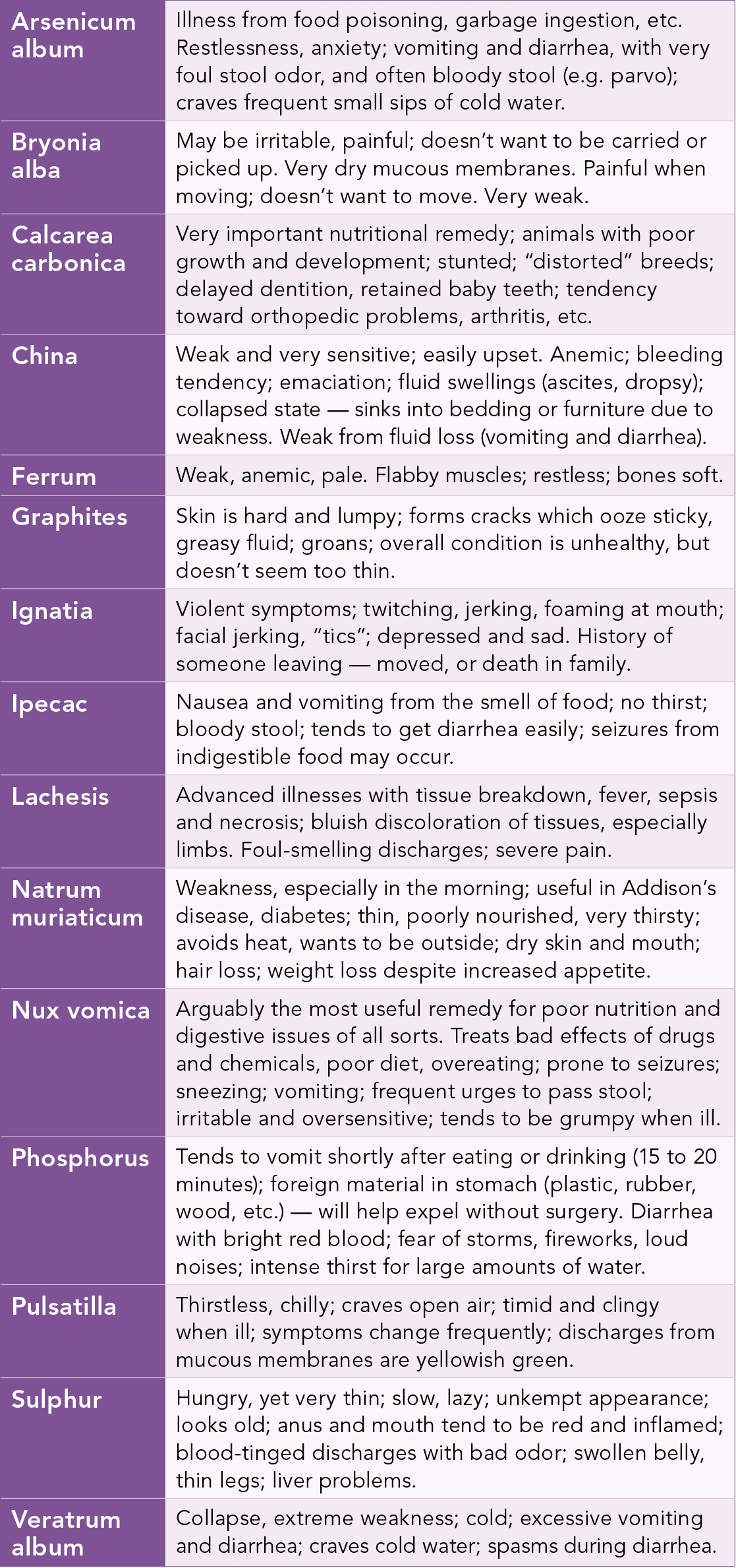 See the table at right for some key homeopathic medicines to consider for treating animals in which nutrition may be a prominent factor, along with some of the hallmark symptoms of each remedy. As a general rule, remedies can be given in low potency (6c or 30c) with good results in chronic disease treatment.