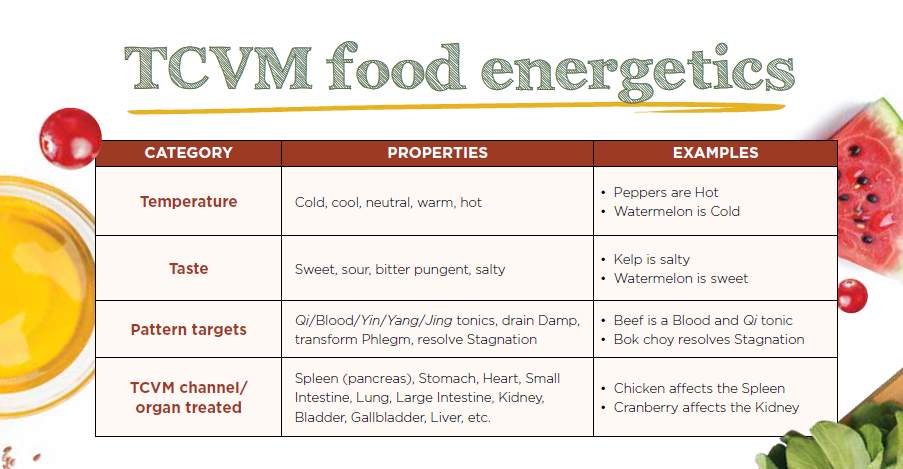 In Traditional Chinese Veterinary Medicine (TCVM), each food has effects on the body that go beyond its nutrient profile. These effects are described as the food’s energetics and include temperature, taste, the patterns treated, and the channels/organs affected.