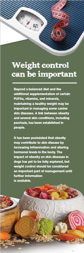 Beyond a balanced diet and the additional supplementation of certain PUFAs, vitamins, and minerals, maintaining a healthy weight may be important in managing some canine skin diseases. A link between obesity and several skin conditions, including psoriasis, has been established in people.
