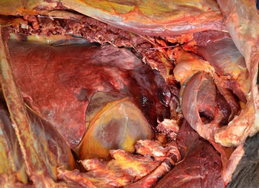 For the above two pictures: A view from above plus a close-up the organs in the chest, and how they sit. Note how the diaphragm and liver are as far cranial as the seventh thoracic rib ventrally.