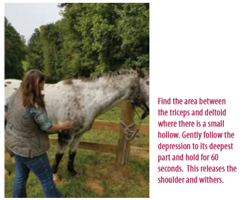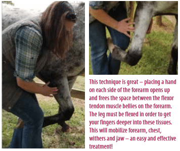 Each nerve going to the axilla (cranial pectoral, suprascapular, subscapular, thoracodorsal, axillary, musculocutaneous, median, radial and ulnar) and exiting the vertebrae from C6 to T2 has its own group of functions. Because they are so closely connected through the fascia in the brachial plexus, and also from restrictions in movement in the pleural dome, immobility in one may affect another. Generally, the branches from C6 and C7 go the pectoral muscles, scapula and latissiumus dorsi (area of saddle/girth sensitivity behind the withers). C7 and C8 innervate the forearm and flexors of the forearm. C8 to T1 innervate the radial nerve, which stimulate the extensors of the limb. T1 and 2 is the ulnar nerve, which includes digital flexors of the limb. Many of these nerves move through the area on the forearm with the muscle bellies of these flexors. Opening the space between these muscles using fascial release can improve mobility of the fetlock, carpus, scapula and thoracic vertebrae in the withers, and the temporal mandibular joint.