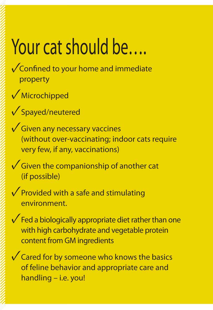 In the next issue, we’ll look at ways to solve these problems as they relate to feral and other homeless felines. In the meantime, if you have one or more of your own, keep them indoors (see sidebar) unless you can supervise them or keep them safely confined to a limited area (e.g. by training them to a harness or leash, or investing in a cat enclosure system). It’s the best thing to do, not only for your community and its human and wildlife populations, but also for your kitty’s own health, safety and well-being!