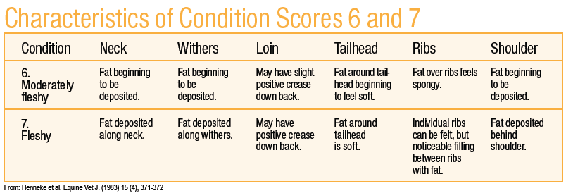 The chart below outlines the characteristics of the desired body condition scores. To help keep condition on a horse, try fenugreek seeds. They are an appetite stimulant and benefit imbalances in the respiratory tract. Add a tablespoon of fenugreek seeds to a feed once a day; however, because they are difficult to digest, steep the seeds in boiling water to soften before adding them and the water to your horse’s feed.