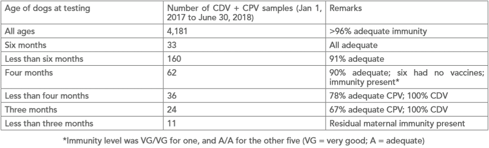 To look as this question, a review of our serum antibody testing for CDV and CPV at Hemopet/Hemolife over the prior 18 months revealed the following: