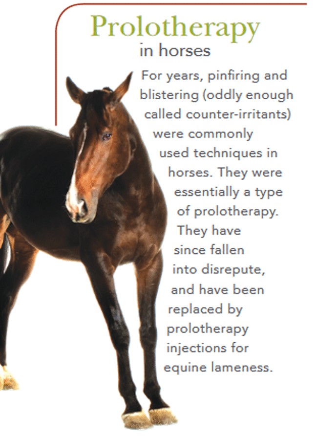 Prolotherapy is an easy procedure that can significantly improve the mobility of any species. Rather than merely masking the pain, it actually results in long term improvements and performance enhancement. While sedation or anesthesia may be needed in some patients, this therapy can be considered for the healthy maintenance of performance animals and geriatrics, as well as for pain relief in all species.