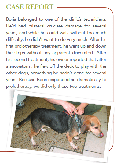 I use prolotherapy extensively for cruciate problems in small dogs, and in what I perceive to be partial cruciate tears in larger dogs. I inject many small blebs of the solution into the retinaculum, and into the lateral collateral ligament, paying particular attention to where it attaches to the bone. When dealing with cruciate problems, I also inject directly into the joint. In this case we use 25% dextrose solution.